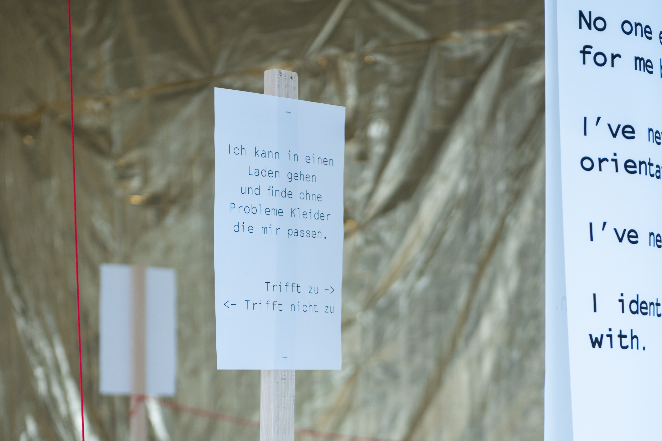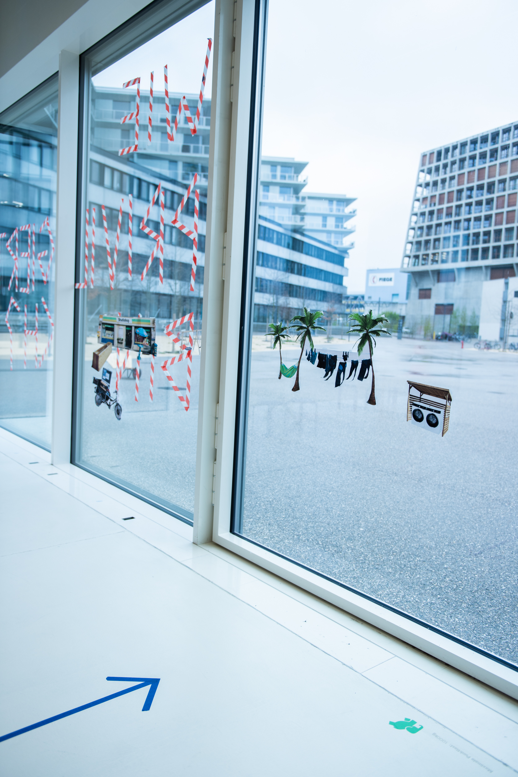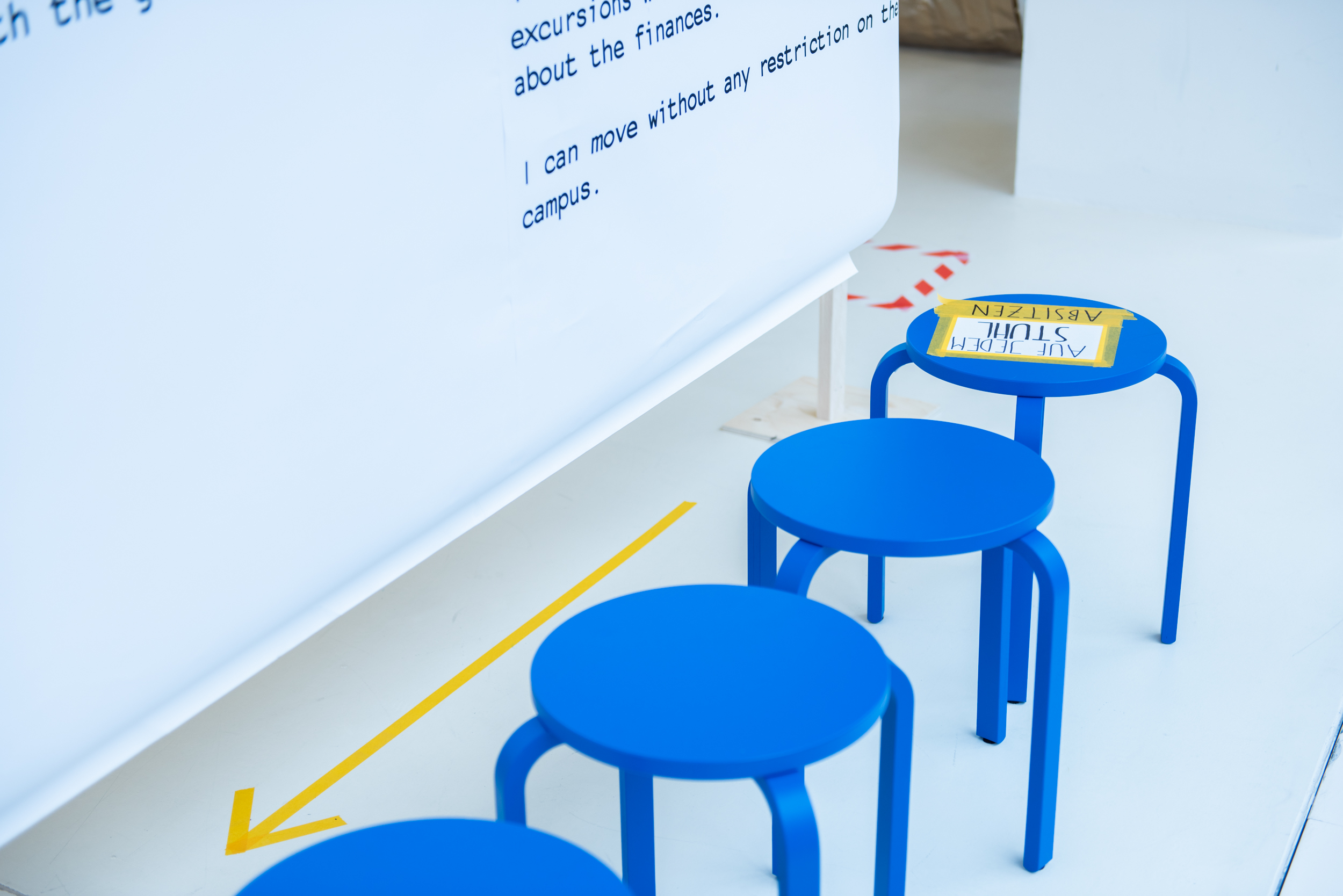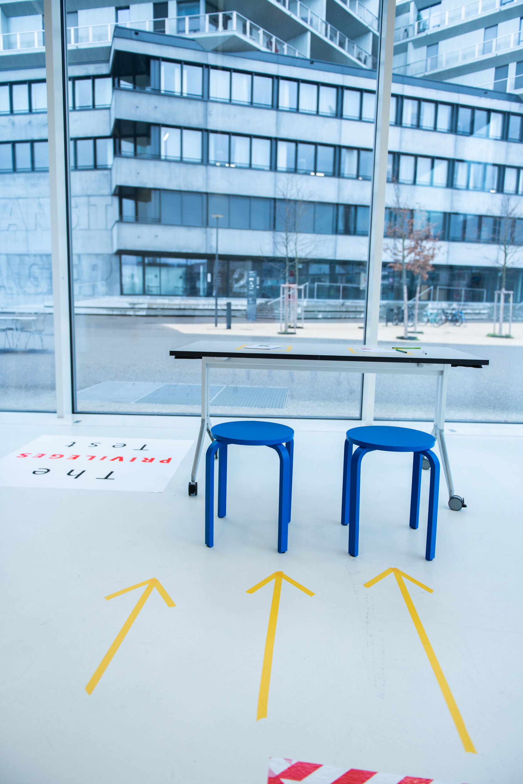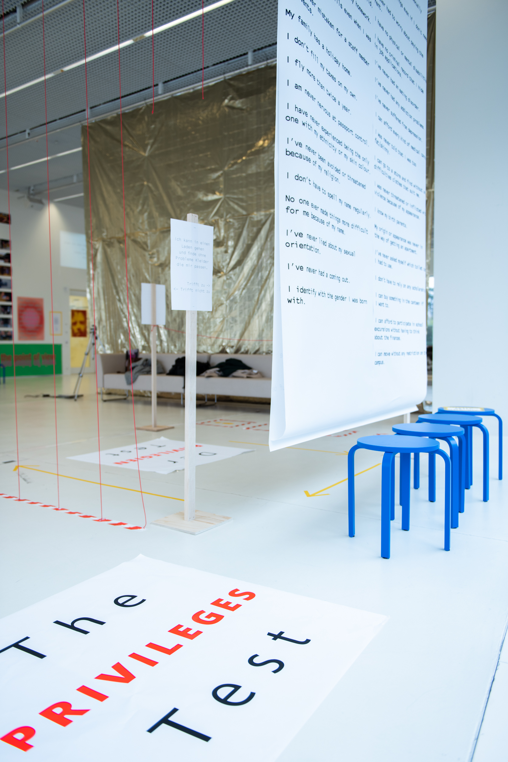 Durch verschiedene Interventionen innerhalb des Raumes untersuchen Soraya, Lora, Linda, Johanna und Vivian die Frage des Privilegs, indem sie die Körper auf dem Campus analysieren. Der Privileg-Test ermöglicht Selbstreflektion. Die Fotografien verschiedener Hände, die Portemonnaies halten, reflektieren den Typ von Körpern, die am Campus dominant sind und zeigen wie privilegiert bin ich? Mit Gaffatape beklebt stellen sie eine klare Warnung dar, die durch das Glas des Foyers in Richtung Passanten “schreit“.