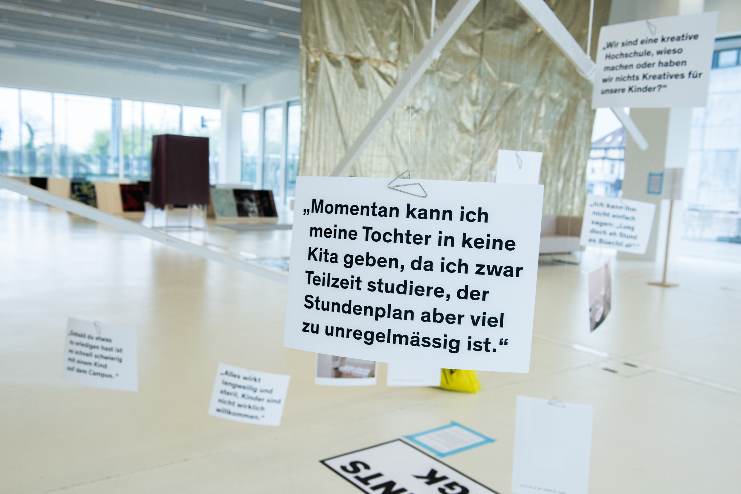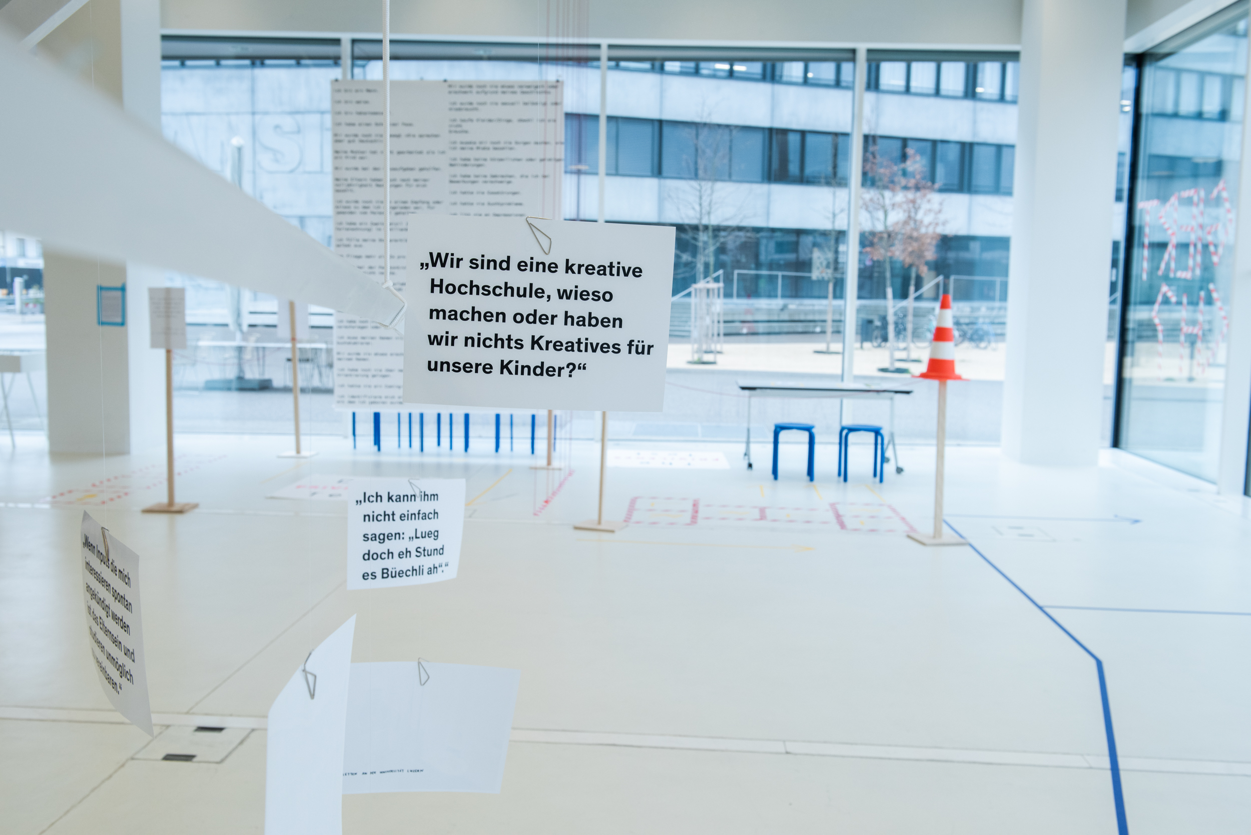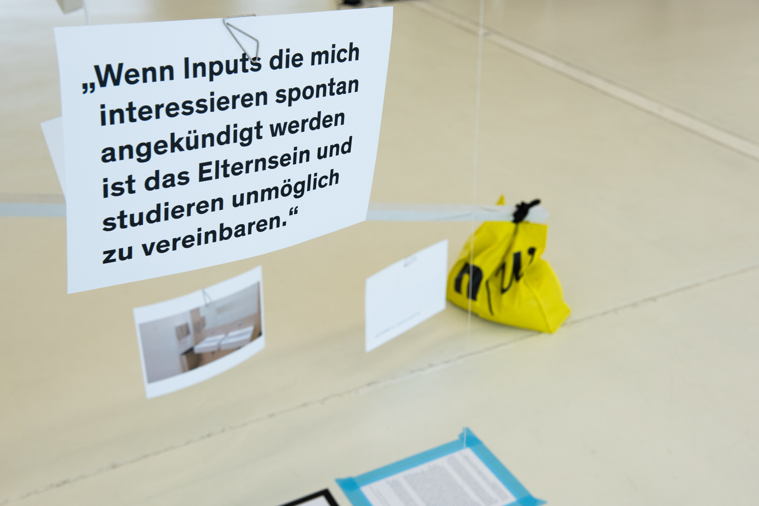 Eltern pumpen Milch in die Toiletten, ihnen fehlen Wickeltische, unsichtbare Eltern, verlorene gegangene Kinder…Die Gruppe Eltern@hkg hat den Mangel inmitten des Überflusses analysiert. Bei der parallelen Untersuchung am Campus und in Gesprächen mit Studierenden, die Eltern sind, zeigen sie auf das unsichtbare, das ungültige. Ihre weiß glänzende vergrößerte Mobile benutzt die sehr weiße, „saubere“, minimalistische formale Sprache des Foyers und der Architektur des HGKs. Dabei zeigen sie auf den Abgrund zwischen dem „normativen“ Modell einer studierenden Person (Single, wohlhabend, kindlos) und denen, die davon „abweichen“, um ihre Bedürfnisse durch den weißen modernen Campusraum nicht erfüllt zu sehen.