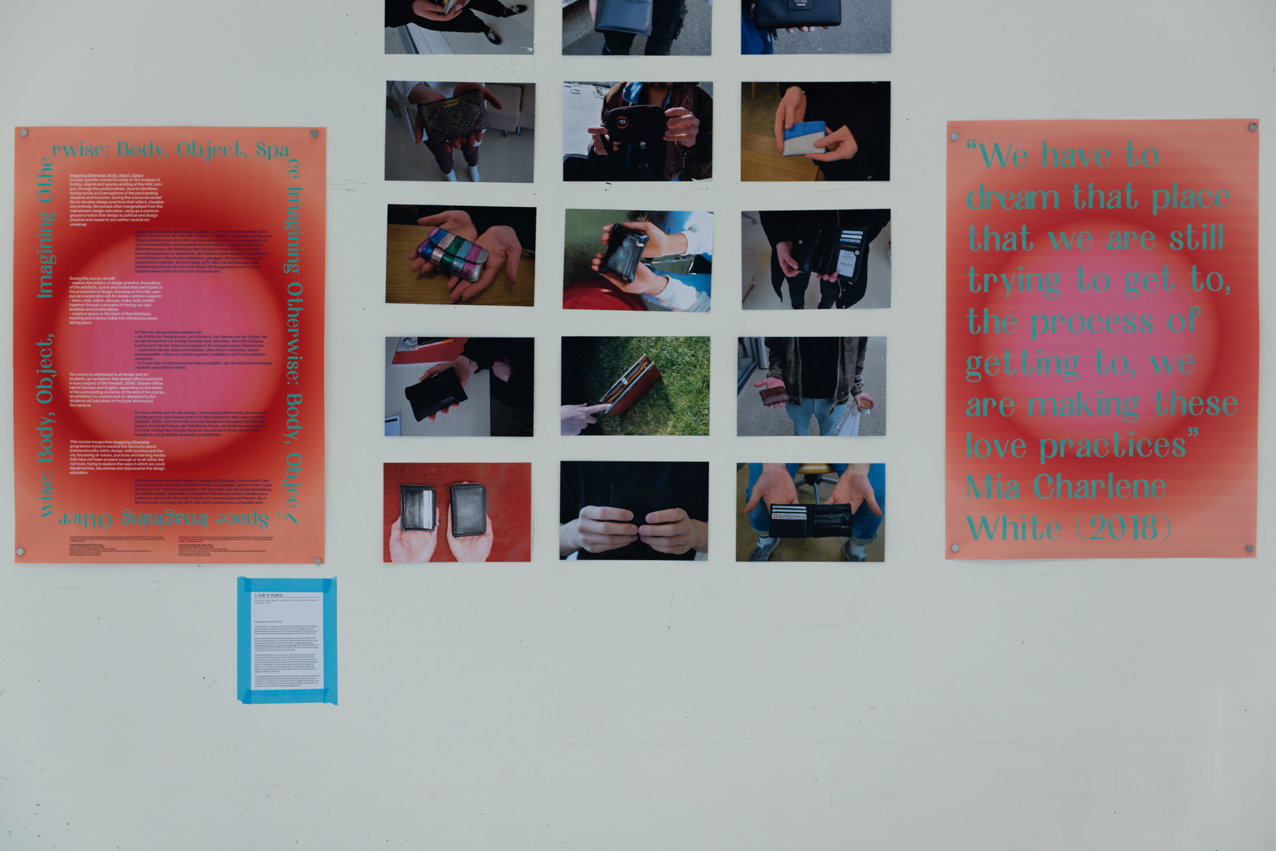 Während des achtwöchigen Kurses „Imagining Otherwise: Body, Object, Space“ haben wir den den Campus der HGK durch die drei Kategorien von Körper, Objekt und Raum analysiert und dabei unsere diversen Positionalitäten, in Gruppen oder individuell, genutzt und Fragen gestellt, anstatt nach Antworten zu suchen. Die im Foyer ausgestellten Arbeiten repräsentieren individuelle Positionen und funktionieren auch im Dialog miteinander. Die Gemeinsamkeit aller Positionen ist die Konfrontation mit dem politischen im Design-Diskurs.
